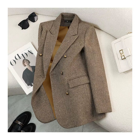 2025 New Arrivals Ladies Tuxedo Blazer Plaid Pattern Winter Coat Double Breasted Business Jacket Button Decoration Knitted Warm