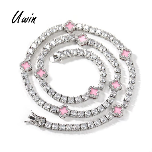 UWIN Mini Pink Clover Tennis Necklace Gold Plated 4 Leaf Clover 4Mm Iced Out Tennis Chain Necklace Fashion Jewelry